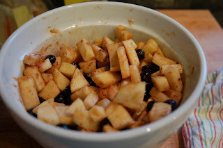 Next, dessert. I love a fruit crisp. It is my favorite type of dessert. I can remember eating it in the cafeteria at school. Even that version delighted me. The blueberries and the apples were from the mountain trip this past weekend, so you know they were very fresh.