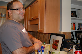 Next, we were treated to a luscious caesar salad. So good. Not a drop left. Chris did all the cooking, and boy can he cook! The entree was linguine with clam sauce with steamed mussels atop. The sauce was so terrific and Chris shared that he used anchovies in the sauce. It was to die for. Here’s a photo of our charming host at work.