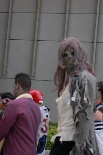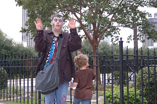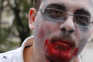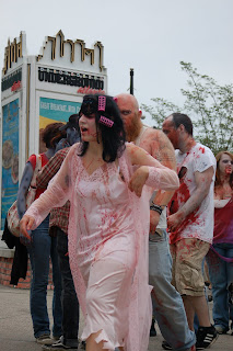 We started out with pedicures at Cure, with Kim and Cheryl. Although our appointment was at 1:30 p.m., we got started a little late and didn’t finish up until 4 p.m. We were supposed to meet Miss DeVore at Oakland Cemetery to shoot zombies for real (with the camera!), but the zombie walk started at 3 p.m., so we didn’t think we could catch them (which, in retrospect, is funny, since zombies are notoriously slow walkers – or lumberers, as Crystal put it..). After our tootsies were done, we dashed to the car and drove to Oakland Cemetery and saw a few zombies. Finally, we met a zombie who was very helpful and told us to drive to Underground Atlanta, where they were all headed. We were richly rewarded with tons of zombies taking to the streets of downtown Atlanta. God bless Crystal, who has a morbid fear of zombies, hanging out of my car window and snapping shots of the undead. She only screamed when they stuck their ghoulish heads in the car. I was so proud of her! Here’s a couple of our favorite shots from the day.